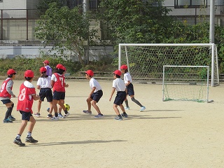体育科の学習でサッカーの学習をしています。自分たちで安全に気をつけて準備をし,協力しながら学習に取り組んでいます。試合中には,「ハイ」「ナイスパス」「ナイスシュート」と言った元気な声が運動場に響いています。