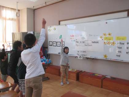 かえるの歌のリズムに合わせて,英語で歌あそびをします。