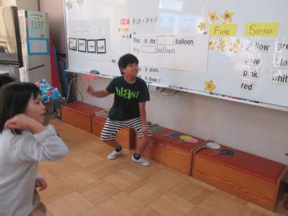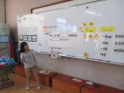 7色のバルーンのペープサートを使って This is 〜♪の歌遊びをしています。