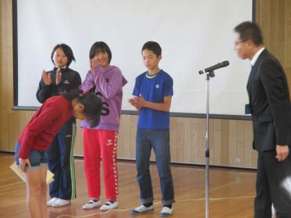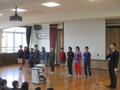大文字駅伝支部予選会で見事2位になり本選に出場することになった6年生が全校児童の前で結果報告をしてくれました。