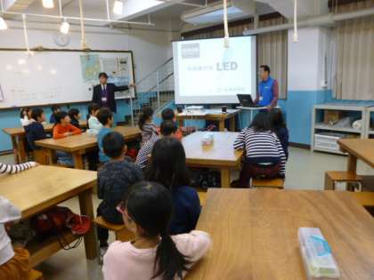 モノづくりの工房学習では,ロームの半導体を使って,LEDを光らせる実験をしました。細い半導体や導線,ホチキスに苦戦しながらも,上手に光らせることができました。
