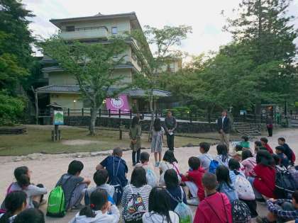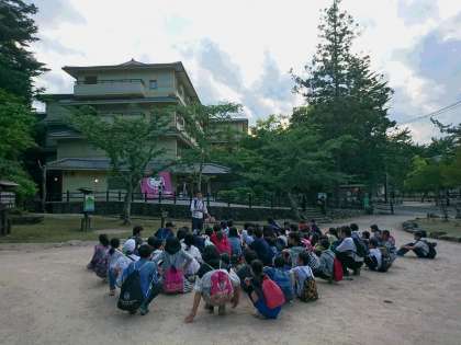 国民宿舎「みやじま杜の宿」に到着し,入館式をしました。夕食を食べ,入浴をすましてから,宮島の夜景を楽しみます。友達と過ごす今晩が楽しみです。