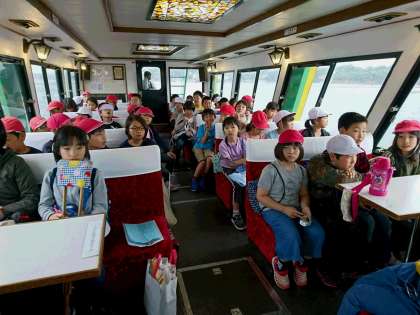 予定通り賢島に着きました。そこから船でみさきの家に向かいます。今日は雨のため,船の2階には上がれませんでした。でも,船内からあご湾を見学しました。