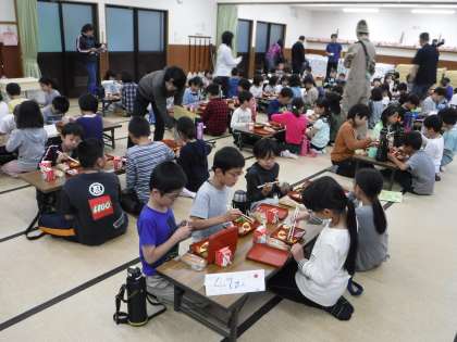 朝の集いの後は,待ちに待った朝食です。予定なら野外炊事場での朝食でしたが,90畳で食べました。