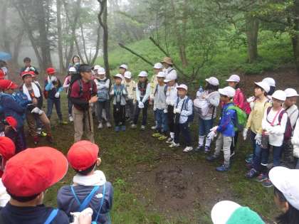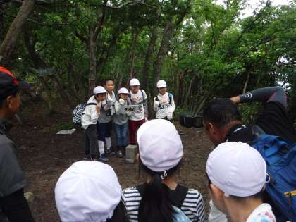天狗杉の頂上に到着です。途中険しい道がいくつもありました。登山途中,野生のシカたちのお風呂後を見たりしました。