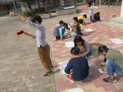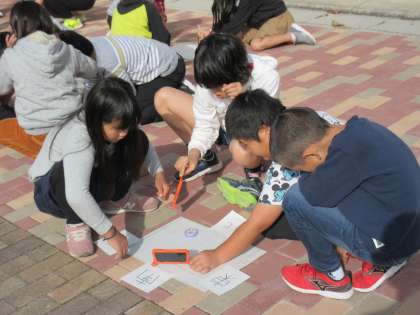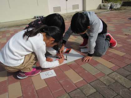 地面に線を書きながら,「少しずつ移動している!」「影の長さも変わっている!」と楽しそうに学習を進めていました。
