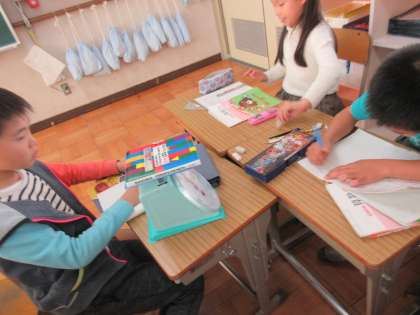 算数「重さ」の学習ではかりを使いました。理科でも使ったはかりですが,目盛りをよむことにまだ慣れていない様子でした。「30gやで!」「一目盛り5gある!」と話合いしながら,身の回りの物を量りました。