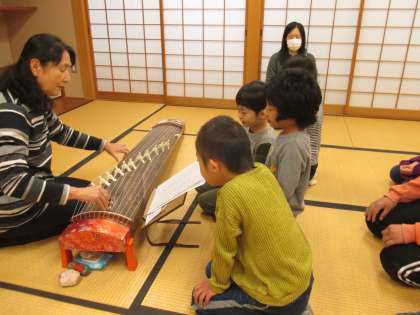 高学年は,爪をつけて”さくら”の一節を演奏し,低学年は打楽器や弦楽器を使いながら