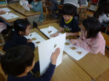 交流では,自分のつくった窓と違う形や開き方を見ておどろいたり,新しいアイデアがうかんだりしている子もいました。