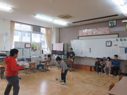 ペアで投げる役,とる役を決め 20秒の間に新聞紙ボールを多くキャッチできるように二人力を合わせていました。