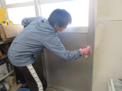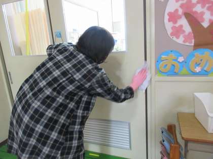 教職員みんなで,校内を消毒しています。