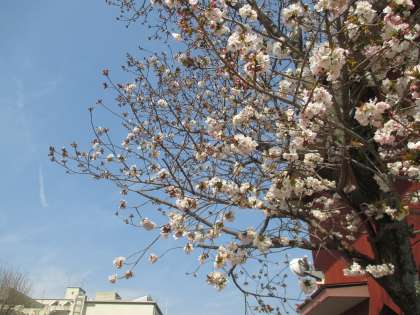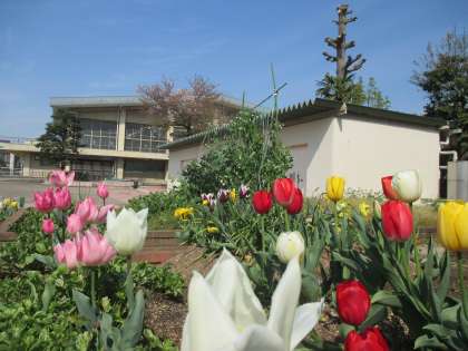 東門の八重桜が、8分咲き。チューリップも花盛り!さやえんどうも食べ頃なのに…!早くコロナから解放され、子どもたちの笑い声のあふれる仁和小にもどりますようにと、願っております。