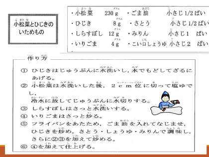 5月に登場する「小松菜とひじきのいためもの」も,カルシウム豊富な人気の副菜です。