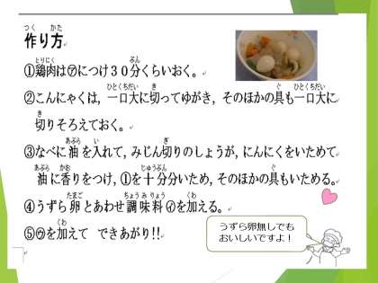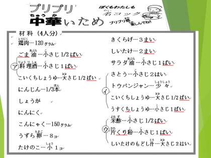 使用する食材・調味料がたくさんありますが,調理法は簡単なので,ぜひご家庭でもお試しくださいね。