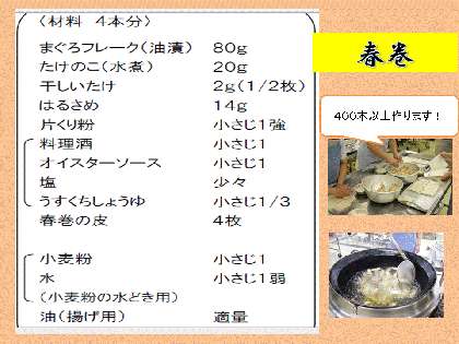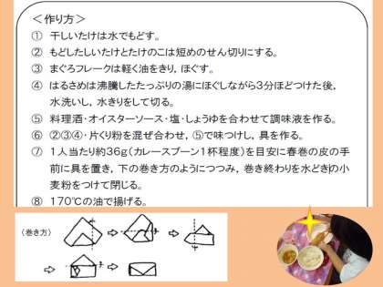 ご家庭でも,ご家族一緒に春巻の具をねったり,包んだり,楽しみながら作って頂ければ幸いです。
