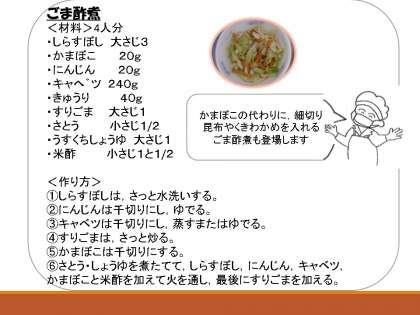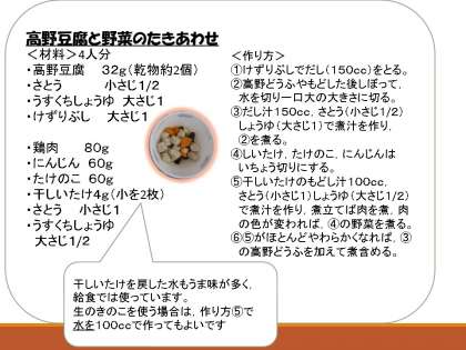 本来なら本日実施の献立の「高野どうふと野菜のたき合わせ」も良質なたんぱく質やカルシウムを多く含む「大豆製品」を使っています。