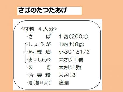 「さばのたつたあげ」は,人気の献立の一つです。しょうが・料理酒・しょうゆに 30 分ほど漬けて下味をつけてから,油で揚げます。