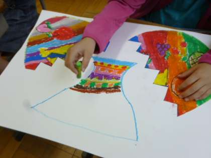 ひみつのたまごから,出てきたものや生まれるお話を想像しながら,絵に表す学習をしています。