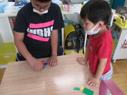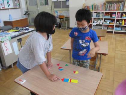 かたちさがしでは,三角形や四角形を分けたりお互いに問題を作って出し合ったりしました。