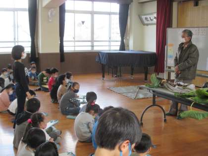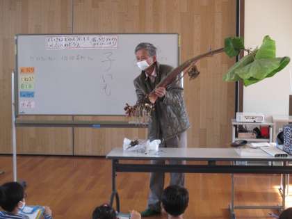 3年生は,社会科「農家でつくられるもの」の学習で,農家の方の生産の工夫について調べています。今日は,地域の佐伯さんをゲストティーチャーにお招きし,「ずいき」について教えていただきました。実際の「ずいき」を見ながら,その根元にできている「頭芋」や「小芋」について,またその呼び方など,さまざまなことを知ることができました。また,「ずいき祭」との関係についても教えていただき,京都の伝統文化のよさにもふれることができました。
