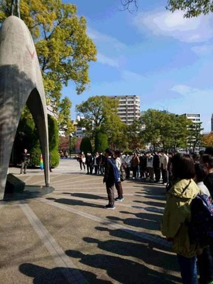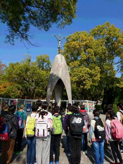 ここでは,戦争,そして平和について考え,みんなで折った千羽鶴を捧げ,平和の鐘を鳴らしました。