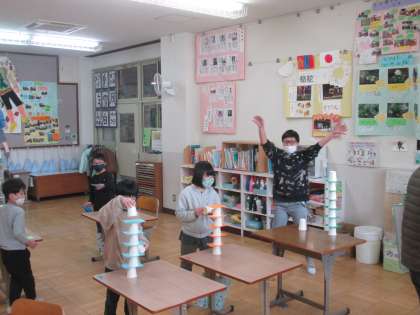 今日のメインは,紙コップつみゲーム!