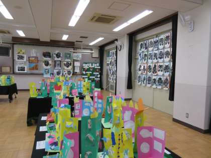 今年度は,初めて校舎内で行なった作品展。子ども達の力作がそろっています。子ども達も他学年の作品を楽しそうに鑑賞していました。