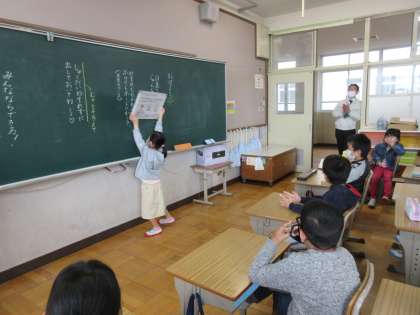 3年生では,朝の会で,ホワイトボードを使って「三択クイズ」をしています。
