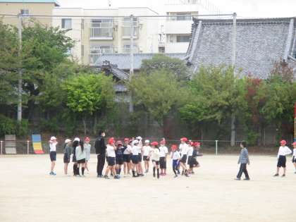 2組は運動場で,ボールを使った体ほぐし運動やおにごっこをしています。
