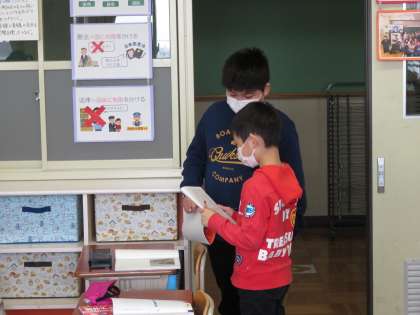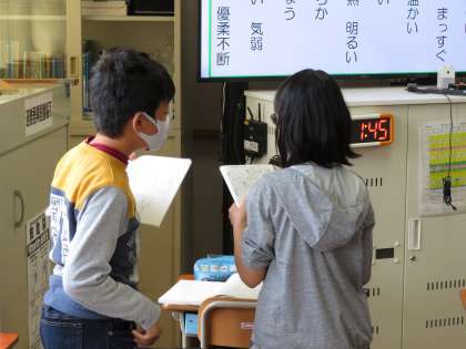 国語科「帰り道」の学習で,登場人物の人物像について話し合いました。自分の考えを広げたり深めたりするために,自ら進んで積極的に話し合おうとする姿が見られます。他の教科や休み時間でも,たくさんの人の意見や価値観について触れ,可能性を広げていってほしいと思います。