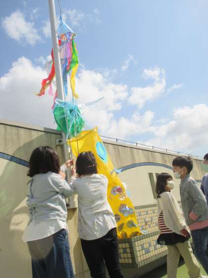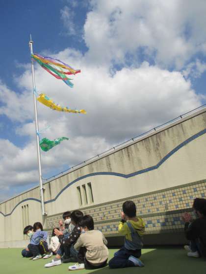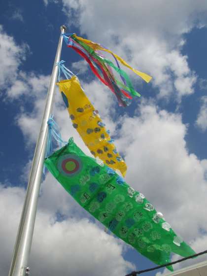 子ども達の願いを込めて 今年は黄色と緑のこいのぼりが空を泳いでいます。