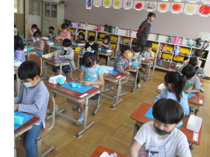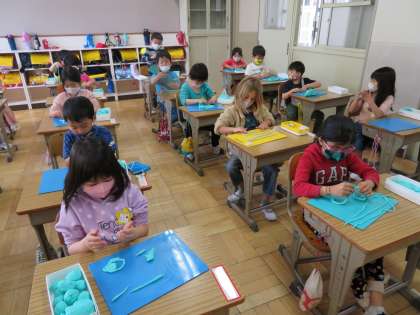 図画工作の学習でねん土をしました。長いひもを作ったり,うずまきにしたり,楽しく取り組んでいました。