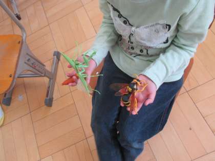今日はみんなが楽しみにしていたオオカマキリとオオスズメバチの重さを比べてみました。