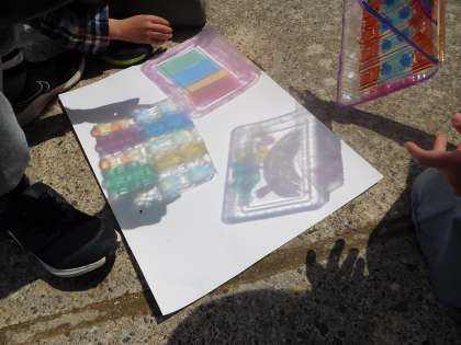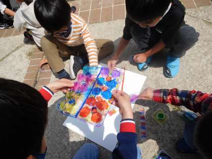 図画工作科で「ひかりのプレゼント」という学習をしました。光をとおすものに色や模様,カラーセロハンをつけて,見え方を考えたり,映すことを楽しんだりしました。子どもたちは,友だちと材料を重ねたり,積んだりすることで,色や形が重なり合うことに気付いていました。「うわー,きれいだなぁ。」「うっとりするなぁ。」そんな言葉がたくさん聞かれた1時間でした。保護者の皆様,カラーペンや材料の準備にご協力下さり,ありがとうございました。