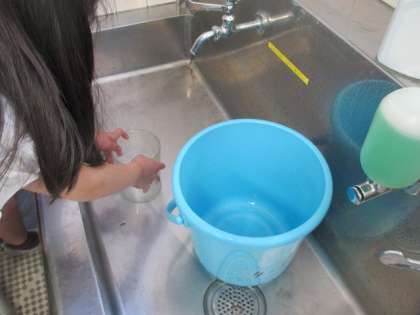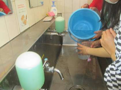 自分たちが普段使っている水道。さてみなさんは一回の手洗いに何Lの水を使うのでしょう。本日1組で実験すると,なんと20L以上。2Lのペットボトルが10本以上です。2組の人ももうすぐ実験します。結果を教えてくださいね。