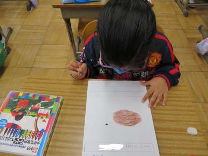 これから生活科の学習であさがおを育てます。今日は,あさがおの種を観察しました。種をさわったり,見たりして気付いたことや感じたことを絵や言葉で表現しました。