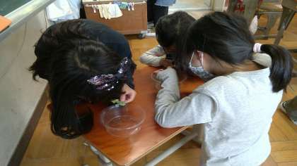 今までの学習で使っていた虫眼鏡を使って卵た幼虫の様子を観察しています。