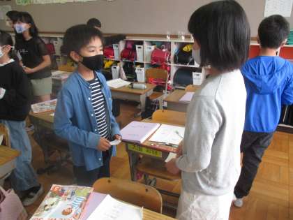 外国語の学習で,自分の名前や好きなものを名刺を使って紹介しました。