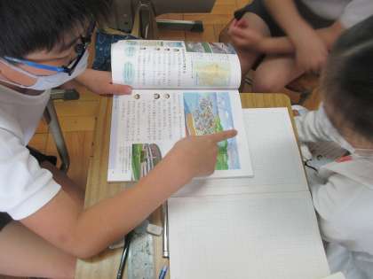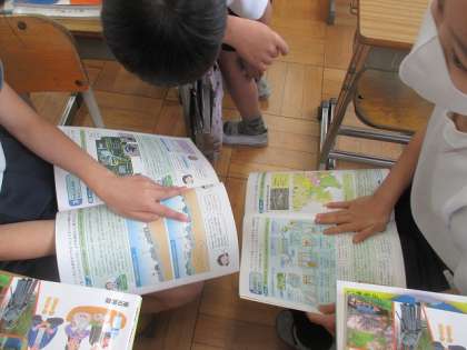 社会科で水道について学習しています。今日はこれまでに出た自分たちの疑問を教科書や副読本を使って調べました。調べてわかったことを友達に伝えています。相手に伝わりやすい話し方を意識して話し合っています。