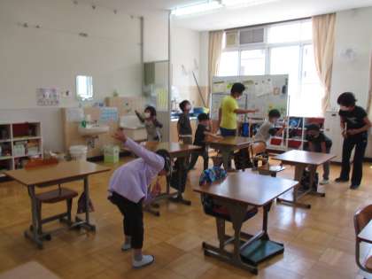 ボディーパーカッションでは,足や手,肩等を使いながら曲に合わせて踊っています。