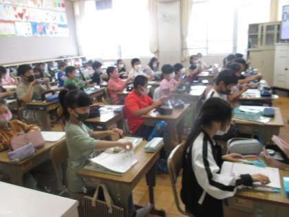 家庭科の学習で2組は「ひと針に心をこめて」を始めました。