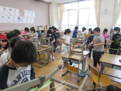 今日の図工では,前回よりも大きな作品を作るために,机やいすを使ってひもをつなげる活動をしました。