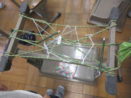 「蜘蛛の巣みたいに見える!」「私のは橋みたい。」「おしゃれな椅子にしてみたよ!」と様々な形を作っていました。近くの友達とアドバイスし合う姿も見られました。