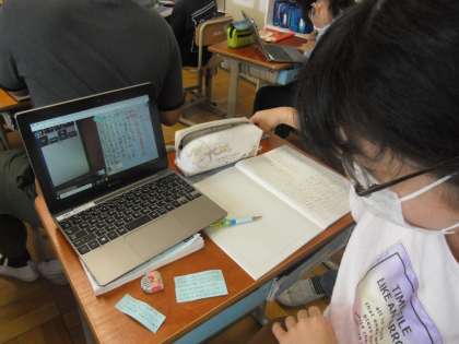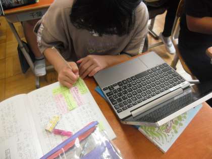 自分のパソコンで友達のノートを読み,それに対する感想を付箋に書いて渡しました。