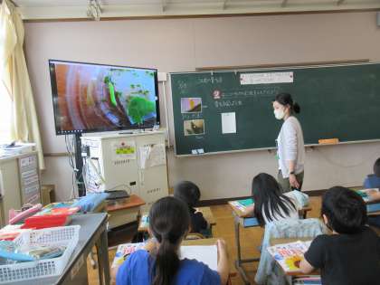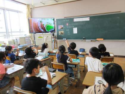 幼虫の観察をしました。テレビの画面に映ったものを観察する子と,実際に幼虫を見る子とを交代しながらしっかりと記録していました。