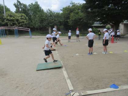 今日の幅跳びでは,自分の役割をしっかりこなしながら,協力して測定することができました。班で協力し,スムーズに進めていくことができました。きれいな跳び方の友達を見て,「腕の動かし方も関係ありそう…。」「踏切板のぎりぎりで踏み切ると遠くまで跳べる。」など,良いところを見つけていました。