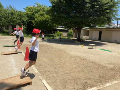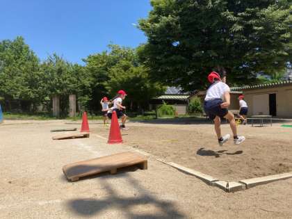 今日の体育は雨で中止でしたが,今週は快晴の中はばとびができました。準備から自分たちで頑張ってしています。踏切の足を意識して跳んでいます。