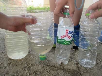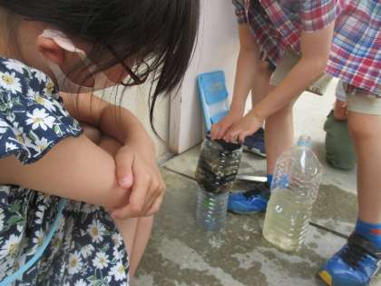前回に続いて水をきれいにしよう企画の第二弾です。布や砂利,木炭を使って自分たちの濾過機をつくって実験開始。何度もろ過を繰り返すことで水がどんどんきれいになりました。