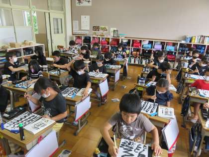 今日はいよいよ筆と墨汁を使って,半紙に点や画を書いてみました。「ほ」の柔らかさを感じたり,筆圧と字の太さについて感じることが出来ました。