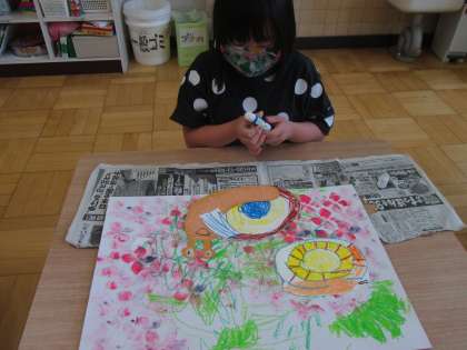 クレパスで好きな色を重ね,かたつむりを作っています。